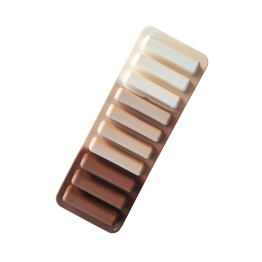 Molde de silicona con formato de barras, ideal para elaborar chocolates tipo barrita, mini tabletas, snacks dulces y rellenos personalizados. Su diseño simple y moderno permite crear piezas prolijas, uniformes y de excelente terminación.