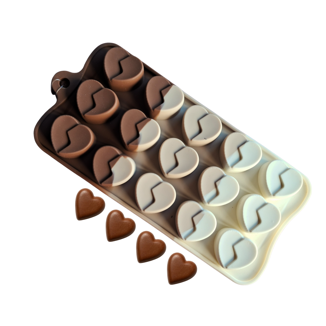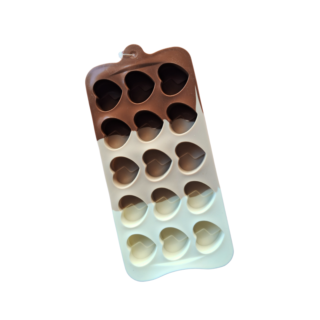 Molde de silicona con corazones en relieve y detalle ondulado, ideal para crear chocolates artesanales, bombones, mini postres y piezas decorativas con un acabado moderno y elegante. Su diseño permite combinar dos o más colores de chocolate, logrando un efecto visual atractivo y profesional.