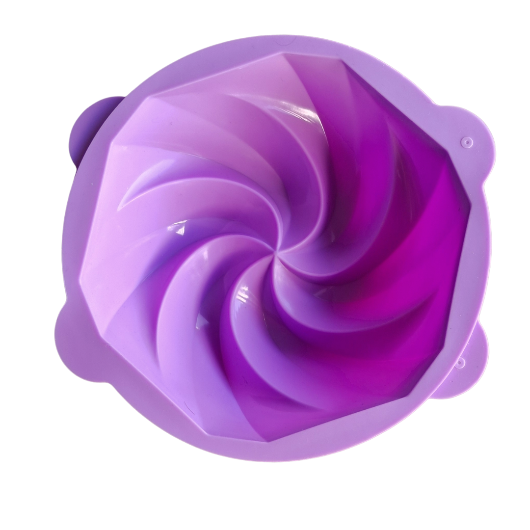 Molde de silicona con diseño espiral tipo circo, ideal para crear tortas, postres y gelatinas con un acabado visual impactante y elegante. Su forma en movimiento genera un efecto moderno que realza cualquier preparación, incluso con recetas simples.