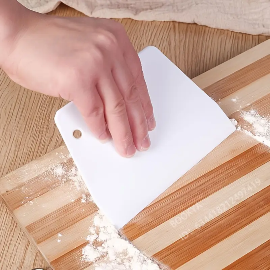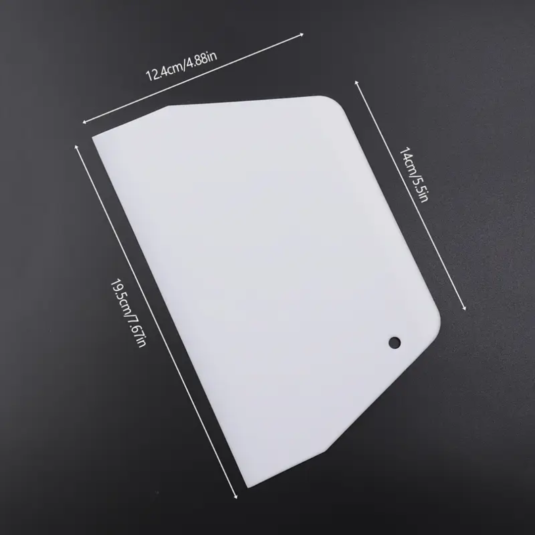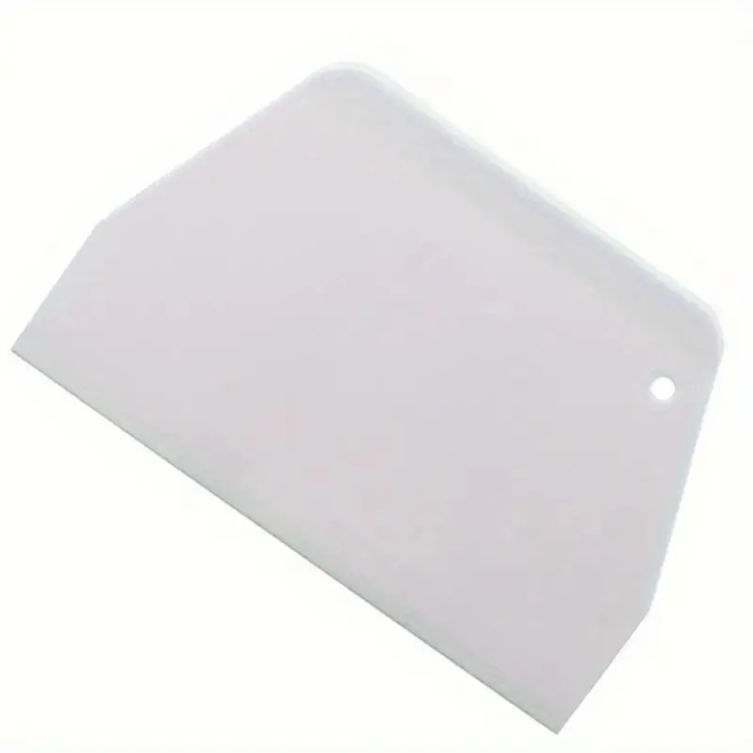 Consigue acabados profesionales en tus tortas y postres con este scraper alisador de plástico, diseñado para lograr superficies lisas y bordes definidos en tus creaciones de repostería.