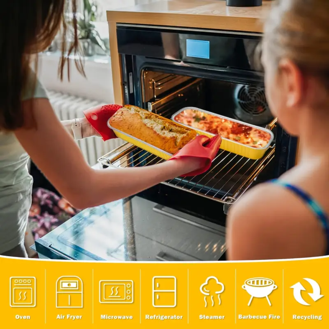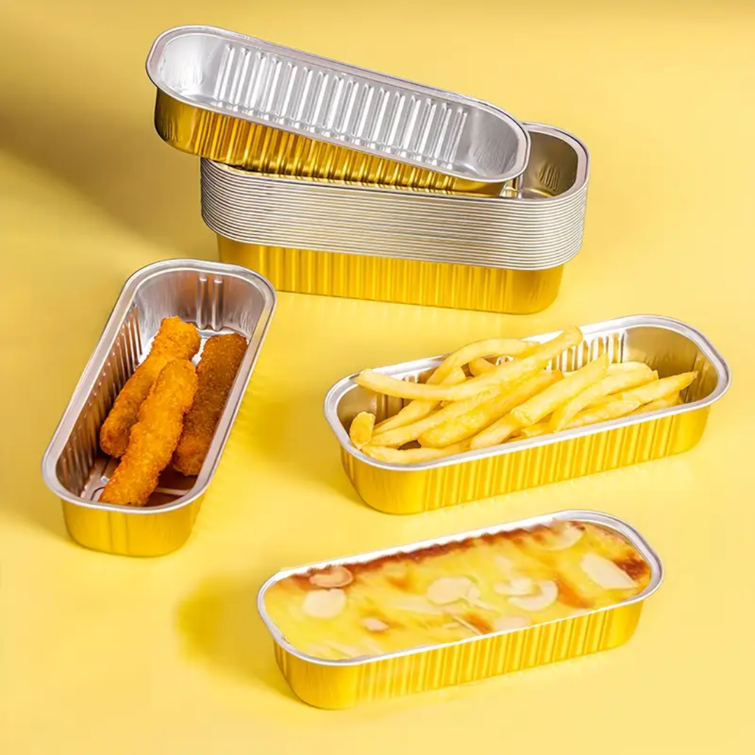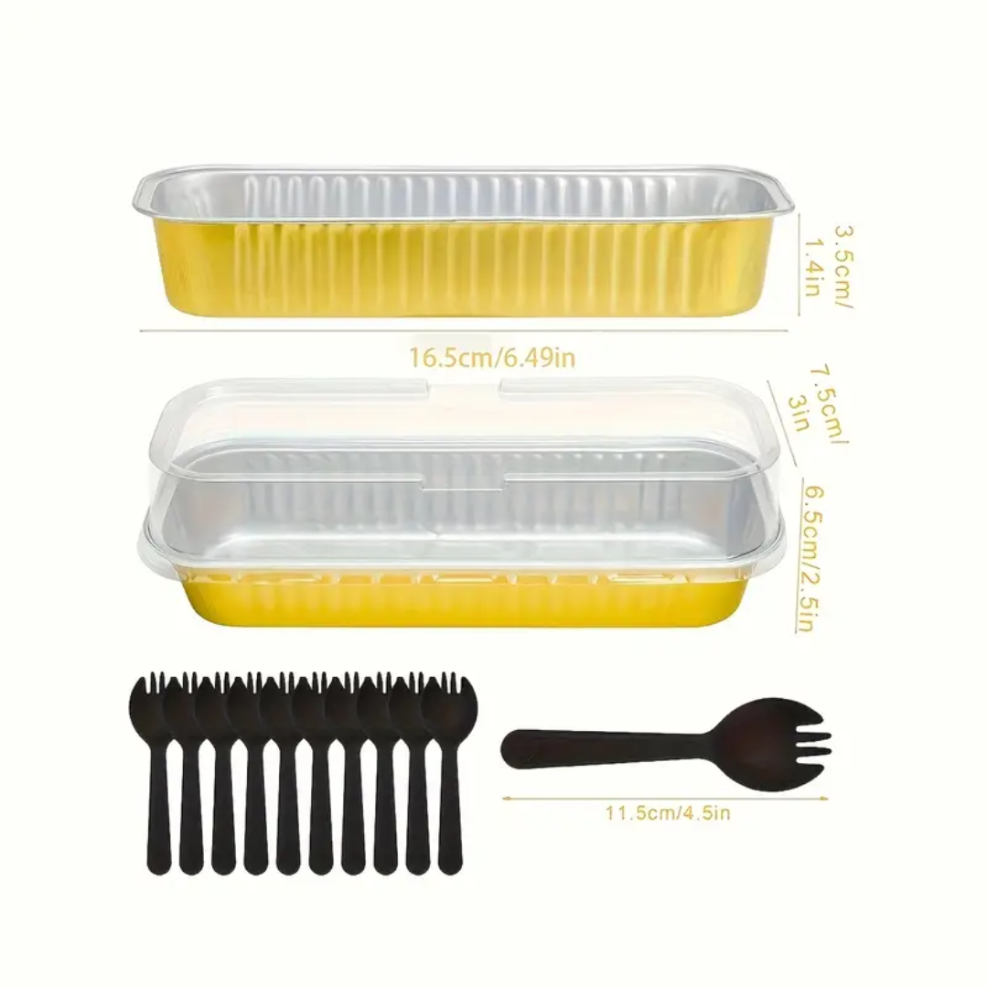 Prácticas y elegantes, estas bandejas rectangulares son perfectas para comidas para llevar, delivery, eventos o almacenamiento de alimentos. Su acabado dorado con interior plateado aporta un toque premium y profesional.