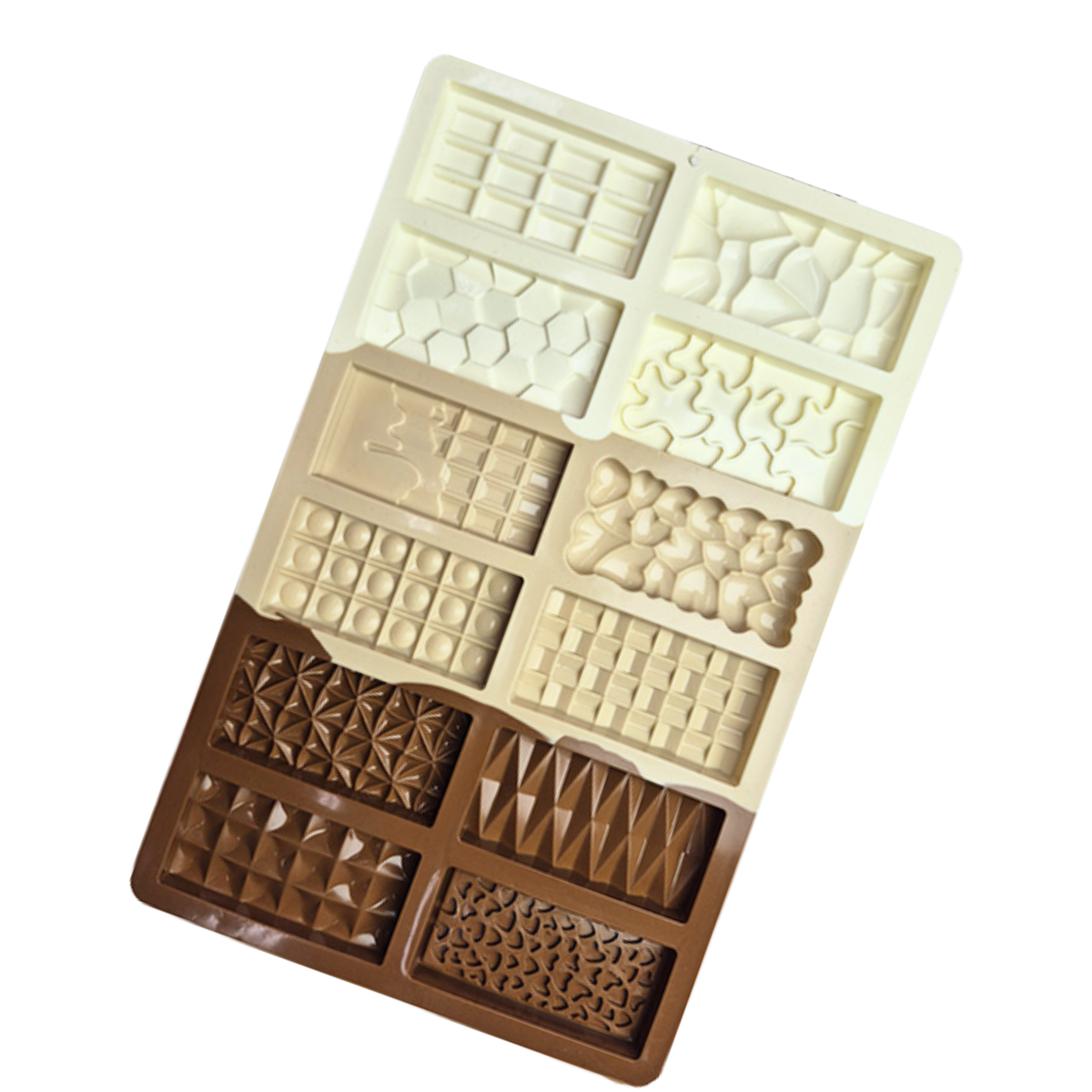 Tableta de silicona para chocolate con múltiples diseños y relieves, ideal para crear chocolates artesanales con una presentación original y llamativa.